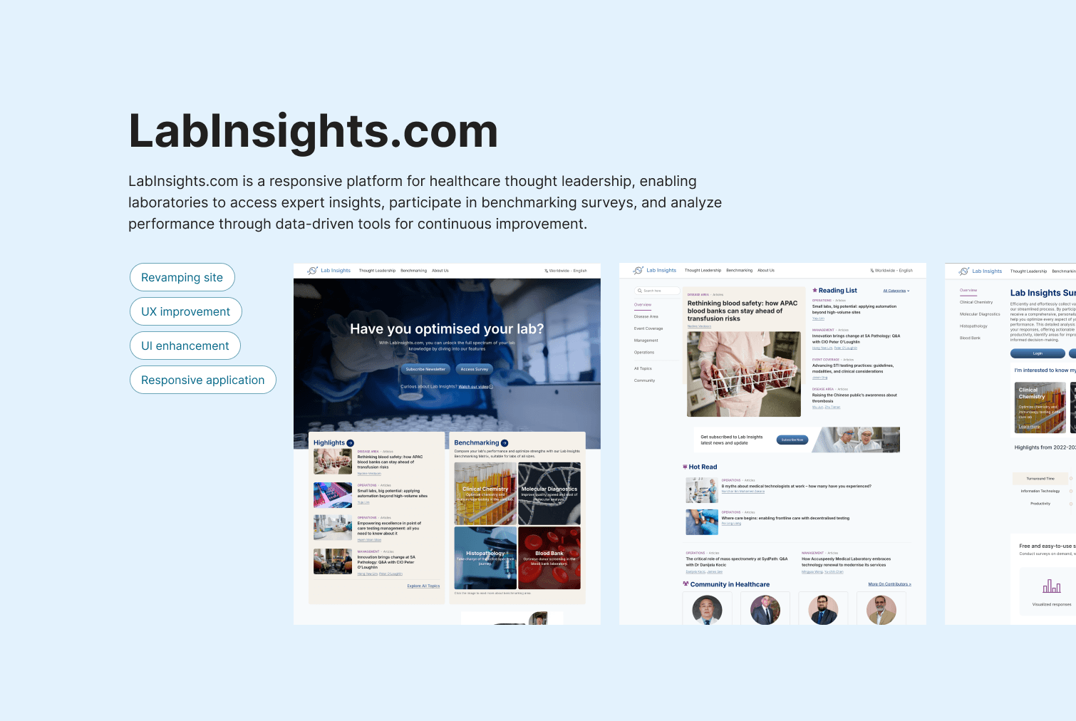 LabInsights.com is a responsive platform for healthcare thought leadership, enabling laboratories to access expert insights, participate in benchmarking surveys, and analyze performance through data-driven tools for continuous improvement.