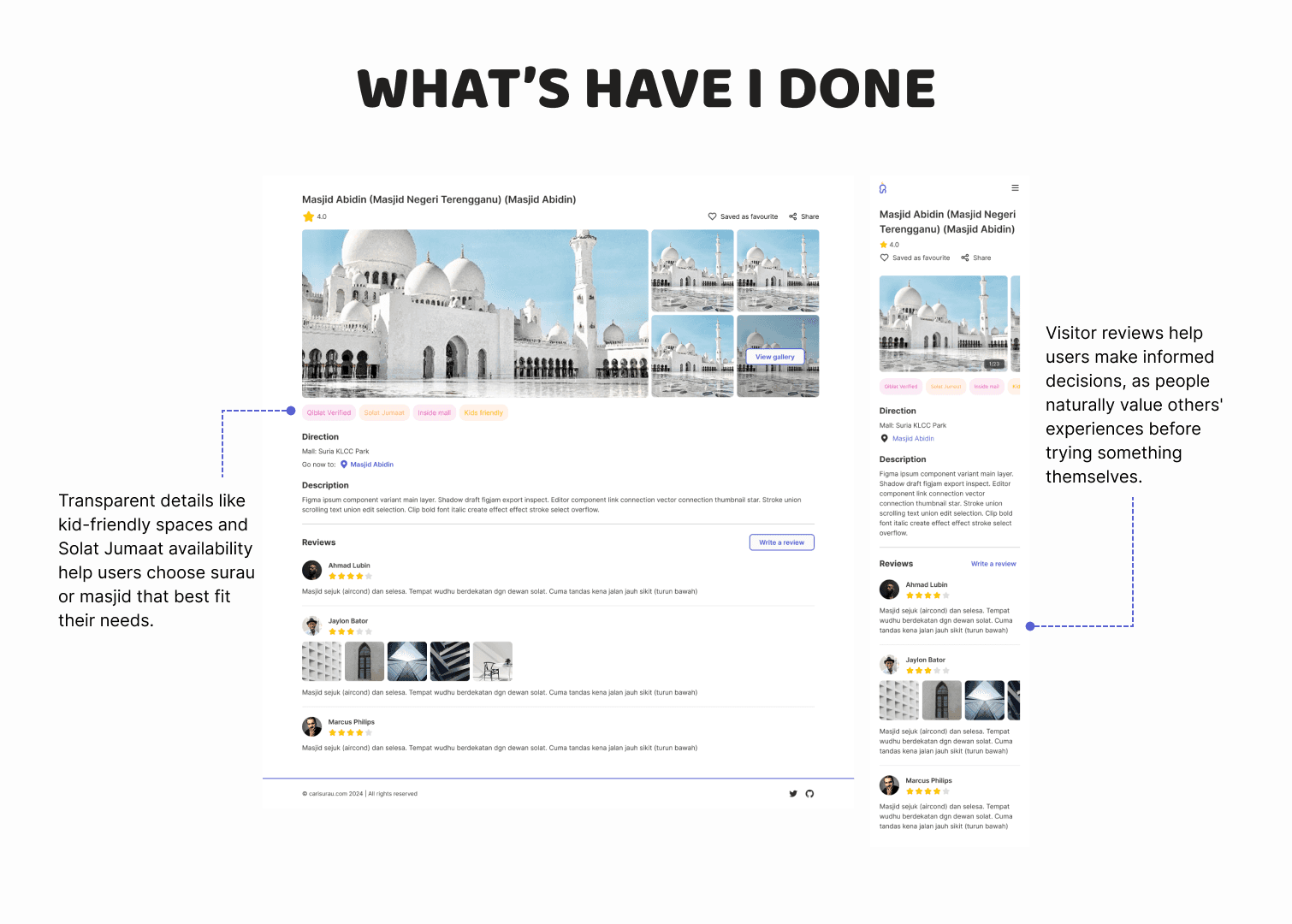 Muslim users, such as traveling technicians and salespeople, often face difficulties locating nearby prayer spaces (surau or masjid) in unfamiliar areas. For example, a technician working in Putrajaya nearly missed his prayer due to inaccessible locations, while a salesperson on assignment in rural areas struggled to find a masjid for Friday prayers. Traditional methods like asking locals or relying on Google Maps were unreliable and inefficient.