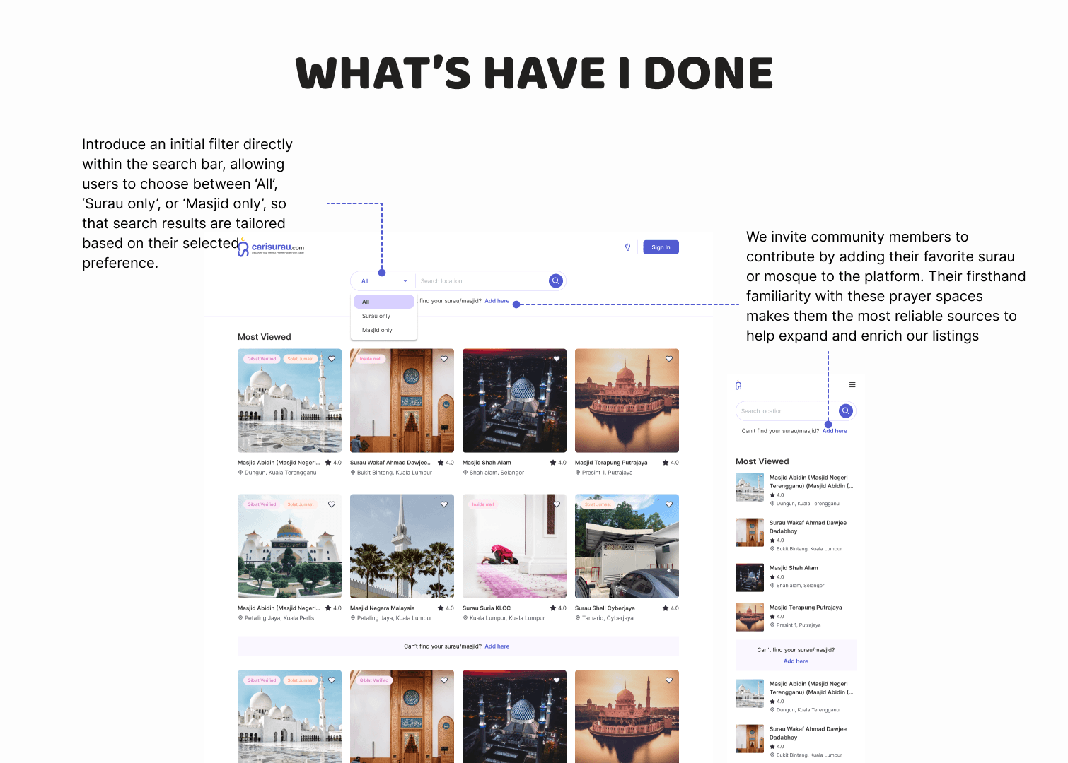 Designed an intuitive search journey with pre-filters (All, Surau only, Masjid only).